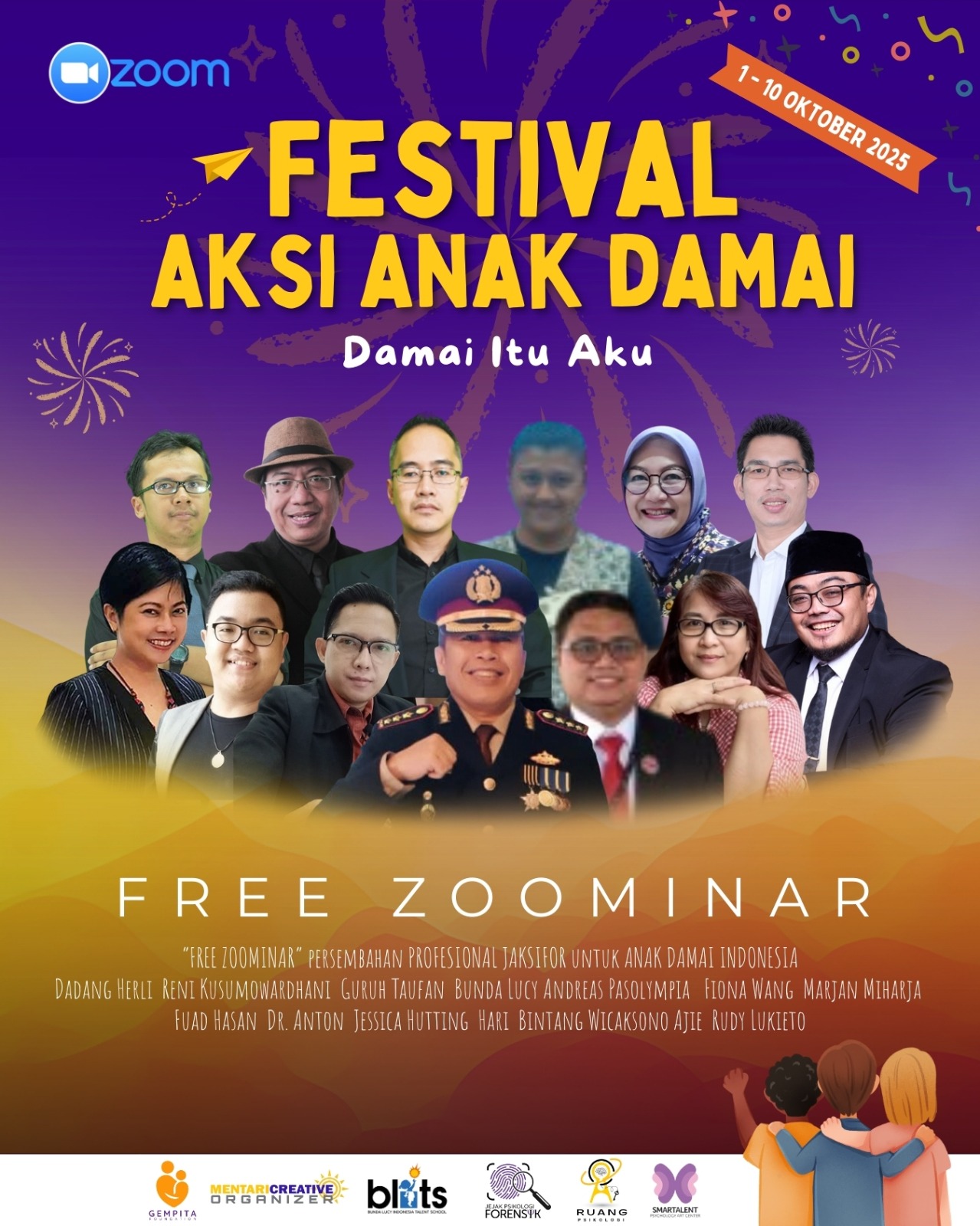 Mari bergabung dalam Free Zoominar yang dipersembahkan oleh para profesional dan pegiat pendidikan, psikologi, dan kemanusiaan untuk mendukung Anak Damai Indonesia.